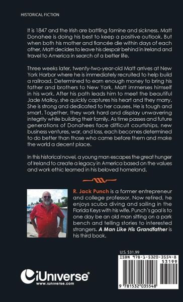 It is 1847 and the Irish are battling famine and sickness. Matt Donahee is doing his best to keep a positive outlook. But when both his mother and fiancée die within days of each other, Matt decides to leave his despair behind in Ireland and travel to America in search of a better life. Three weeks later, twenty-two-year-old Matt arrives at New York Harbor where he is immediately recruited to help build a railroad. Determined to earn enough money to bring his father and brothers to New York, Matt immerses himself in his work. After his path leads him to meet the beautiful Jade Malloy, she quickly captures his heart and they marry. She is strong and dedicated to her causes. He is tough and smart. Together, they work hard and display unwavering integrity while building their family. As time passes and future generations of Donahees face difficult courtships, new business ventures, war, and loss, each becomes determined to do better than those who came before them and make the world a decent place. In this historical novel, a young man escapes the great hunger of Ireland to create a legacy in America based on the values and work ethic learned in his beloved homeland.
