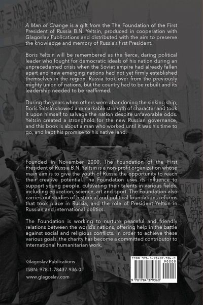 Boris Yeltsin will be remembered as the fierce, daring political leader who fought for democratic ideals of his nation during an unprecedented crisis when the Soviet empire had already fallen apart and new emerging nations had not yet firmly established themselves in the region. Russia took over from the previously mighty union of nations, but the country had to be rebuilt and its leadership needed to be reaffirmed. During the years when others were abandoning the sinking ship, Boris Yeltsin showed a remarkable strength of character and took it upon himself to salvage the nation despite unfavorable odds. Yeltsin created a stronghold for the new Russian governance, and this book is about a man who worked until it was his time to go, and kept his promise to his native land. A Man of Change is a gift from the Foundation of the First President of the Russian Federation B.N. Yeltsin otherwise known as The Yeltsin Fund, produced in cooperation with Glagoslav Publications and distributed with the aim to preserve the knowledge and memory of Russia's first President. Material by the following was used: V.A. Boikov, A.D. Kirillov, G.M. Kayota. Glagoslav Publications neither shares nor assumes responsibility for author's political and other views and opinions as expressed or interpreted in this book.