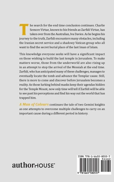 The search for the end time conclusion continues. Charlie Semore Virtue, known to his friends as Zarfidi Virtue, has taken over from the Australian, Iva Davies. As he begins his journey to the truth, Zarfidi encounters many obstacles, including the Iranian secret service and a shadowy Vatican group who all want to find the secret burial place of the last Iman of Islam. This knowledge everyone seeks will have a significant impact on those wishing to build the last temple in Jerusalem. To make matters worse, those from the underworld are also rising up in an attempt to stop the arrival of the Messiah at the end time. Zarfidi, who has anticipated many of these challenges, manages to eventually locate the tomb and advance the Templar cause. Still, there is more to come and discover before Jerusalem becomes a reality. As those lurking behind masks keep their agendas hidden for the Temple Mount, now only time will tell if Zarfidi will be able to see past his perceptions and find his way out the world that has trapped him. A Man of Colours continues the tale of two Gemini knights as one attempts to overcome multiple challenges to carry on an important cause during a different period in history.
