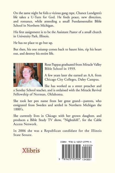 CHANCE LUNDGREN---On the same night he foils a vicious gang rape, Chance Lundgren's life takes a U-Turn for God. He finds peace, new direction, and romance, while attending a small, Fundamentalist Bible College in rural Northern Michigan. His first assignment is to be the Assistant Pastor of a small church congregation in University Park, Illinois. He has no place to go but up. Then his one misstep comes back to haunt him, rip his heart out, and destroy his entire life. DEMI SANDOVAL---sweet, friendly, dark-haired, fire-eyed. Incredibly beautiful. Innocence violated. JADE POE---thin, blond, athletic, smart and generous hearted. She found no contradiction at all between being a feminist and being a faithful Christian wife. DEACON OLAF BROWN-rough-hewn, country-bred. Retired to a Chicago suburb, in order to spend his remaining days caring for God's House. He just liked the Kid. DEAN MARQUETTE---the Pharisee PROFESSOR FLOYD URBAN---elderly, short, skinny, a perpetual twinkle in his eyes. He likes to recite poetry. His rule of life is to always do the kind thing. REVEREND PAXTON STONE---He just wasn't right. BILL WYNN---He considered being the class clown to be a high and holy calling. DALE MARATINDALE---Like Jesus, he was a carpenter. Like the ancient Prophet Hosea, he went down to the whorehouse and found himself a bride. CRYSTAL---The Prodigal. The whore who learned that God knew her last name. CINDY---A little child shall lead them. CREW---If you needed bowl of shrimp, or if you needed man killed, he was always there to do you a favor.
