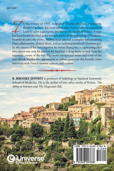 In the winter of 1957, Inspector Charles Maillot, a homicide detective in Paris, has been called away from a culinary sojourn in Lyon to solve a gruesome murder in the South of France. A man has been found crucified at the summer home of the archbishop of Toulouse. In order to solve the crime, Maillot must unravel a complex web involving Nazi collaboration, clerical abuse, and an outlawed medieval Christian sect. In the course of his investigation he meets Françoise, a captivating chef who shares not only his passion for food but a deep desire to heal from the traumatic events of the war. The many unexpected twists and turns of the case affords Maillot the opportunity to reflect upon how this horrific crime intersects with French history, culture, and cuisine.
