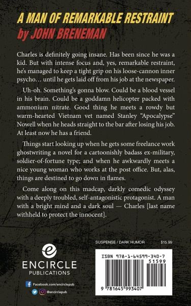 Charles is definitely going insane. Has been since he was a kid. But with intense focus and, yes, remarkable restraint, he's managed to keep a tight grip on his loose-cannon inner psycho... until he gets laid off from his job at the newspaper. Uh-oh. Something's gonna blow. Could be a blood vessel in his brain. Could be a helicopter packed with ammonium nitrate. Good thing he meets a rowdy but warm-hearted Vietnam Vet named Stanley "Apocalypse" Nowell when he heads straight to the bar after losing his job. At least now he has a friend. Things appear to be looking up when he gets some freelance work ghostwriting a novel for a cartoonishly badass ex-military, soldier-of-fortune type; and when he awkwardly meets a nice young woman who works at the post office. But, alas, things are destined to go down in flames. Come along on this madcap, darkly comedic odyssey with a deeply troubled, self-antagonistic protagonist. A man with a bright mind and a dark soul - Charles [last name withheld to protect the innocent].