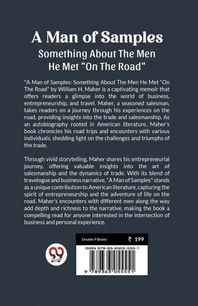"A Man of Samples: Something About The Men He Met "On The Road" by William H. Maher is a captivating memoir that offers readers a glimpse into the world of business, entrepreneurship, and travel. Maher, a seasoned salesman, takes readers on a journey through his experiences on the road, providing insights into the trade and salesmanship. As an autobiography rooted in American literature, Maher's book chronicles his road trips and encounters with various individuals, shedding light on the challenges and triumphs of the trade. Through vivid storytelling, Maher shares his entrepreneurial journey, offering valuable insights into the art of salesmanship and the dynamics of trade. With its blend of travelogue and business narrative, "A Man of Samples" stands as a unique contribution to American literature, capturing the spirit of entrepreneurship and the adventure of life on the road. Maher's encounters with different men along the way add depth and richness to the narrative, making the book a compelling read for anyone interested in the intersection of business and personal experience.