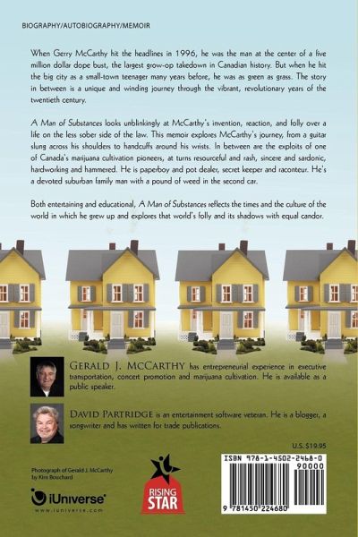 When Gerry McCarthy hit the headlines in 1996, he was the man at the center of a five million dollar dope bust, the largest grow-op takedown in Canadian history. But when he hit the big city as a small-town teenager many years before, he was as green as grass. The story in between is a unique and winding journey through the vibrant, revolutionary years of the twentieth century. A Man of Substances looks unblinkingly at McCarthy's invention, reaction, and folly over a life on the less sober side of the law. This memoir explores McCarthy's journey, from a guitar slung across his shoulders to handcuffs around his wrists. In between are the exploits of one of Canada's marijuana cultivation pioneers, at turns resourceful and rash, sincere and sardonic, hardworking and hammered. He is paperboy and pot dealer, secret keeper and raconteur. He's a devoted suburban family man with a pound of weed in the second car. Both entertaining and educational, A Man of Substances reflects the times and the culture of the world in which he grew up and explores that world's folly and its shadows with equal candor.