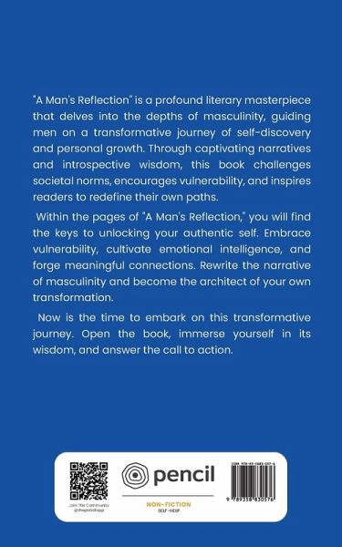 ""A Man's Reflection"" is a profound literary masterpiece that delves into the depths of masculinity, guiding men on a transformative journey of self-discovery and personal growth. Through captivating narratives and introspective wisdom, this book challenges societal norms, encourages vulnerability, and inspires readers to redefine their own paths. Within the pages of ""A Man's Reflection,"" you will find the keys to unlocking your authentic self. Embrace vulnerability, cultivate emotional intelligence, and forge meaningful connections. Rewrite the narrative of masculinity and become the architect of your own transformation. Now is the time to embark on this transformative journey. Open the book, immerse yourself in its wisdom, and answer the call to action.