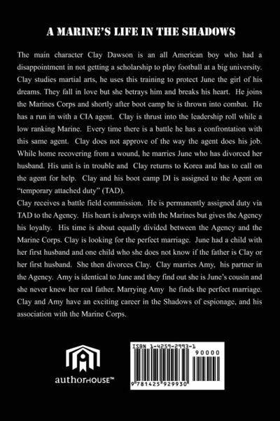 The main character Clay Dawson is an all American boy who had a disappointment in not getting a scholarship to play football at a big university. Clay studies martial arts, he uses this training to protect June the girl of his dreams. They fall in love but she betrays him and breaks his heart. He joins the Marines Corps and shortly after boot camp he is thrown into combat. He has a run in with a CIA agent. Clay is thrust into the leadership roll while a low ranking Marine. Every time there is a battle he has a confrontation with this same agent. Clay does not approve of the way the agent does his job. While home recovering from a wound, he marries June who has divorced her husband. His unit is in trouble and Clay returns to Korea and has to call on the agent for help. Clay and his boot camp DI is assigned to the Agent on "temporary attached duty" (TAD). Clay receives a battle field commission. He is permanently assigned duty via TAD to the Agency. His heart is always with the Marines but gives the Agency his loyalty. His time is about equally divided between the Agency and the Marine Corps. Clay is looking for the perfect marriage. June had a child with her first husband and one child who she does not know if the father is Clay or her first husband. She then divorces Clay. Clay marries Amy, his partner in the Agency. Amy is identical to June and they find out she is June's twin sister, they were separated at birth. Marrying Amy he finds the perfect marriage. Clay and Amy have an exciting career in the Shadows of espionage, and his association with the Marine Corps.