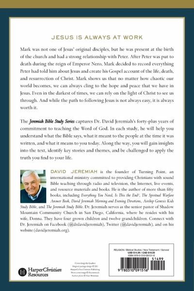 Jesus is always at work and active... Follow Dr. Jeremiah through the gospel of Mark in a chapter-by-chapter study that will help you understand what it meant to the people at the time it was written, and what it means to Christians today. Mark's gospel was likely the first written record of the life of Jesus Christ, and it's full of energy and action. The word immediately appears so often in the text that it's hard not to get caught up in the pace of the narrative as Jesus moves to establish his kingdom in a way that was completely unanticipated. However, Mark also begins his account with words from Isaiah the prophet, making it (immediately) clear that--had the religious leaders of the time been paying attention--they might have been a little more prepared for the arrival of the Messiah and for everything that happened next... Each of this study's twelve lessons is clearly organized to include: Getting Started: An opening question to introduce you to the lesson. Setting the Stage: A short reflection to explain the context of the study. Exploring the Text: The Scripture reading for the lesson with related study questions. Reviewing the Story: Questions to help you identify key points in the reading. Applying the Message: Questions to help you apply the key ideas to their lives. Reflecting on the Meaning: A closing reflection on the key teachings in the lesson. --ABOUT THE SERIES-- The Jeremiah Bible Study Series captures Dr. David Jeremiah's forty-plus years of commitment in teaching the Word of God. In each study, you'll gain insights into the text, identify key stories and themes, and be challenged to apply the truths you uncover to your life. By the end of each study, you'll come away with a clear and memorable understanding of that Bible book. Each study also contains a Leader's Guide.