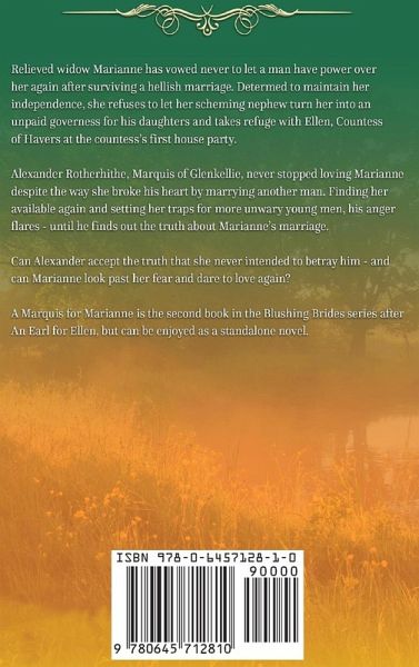 Relieved widow Marianne has vowed never to let a man have power over her again after surviving a hellish marriage. Determined to maintain her independence, she refuses to let her scheming nephew turn her into an unpaid governess for his daughters and takes refuge with Ellen, Countess of Havers, at the countess's first house party. ¿ Alexander Rotherhithe, Marquis of Glenkellie, never stopped loving Marianne despite the way she broke his heart by marrying another man. Finding her available again and setting her traps for more unwary young men, his anger flares - until he finds out the truth about Marianne's marriage.¿ Can Alexander accept the truth that she never intended to betray him - and can Marianne look past her fear and dare to love again? A Marquis for Marianne is the second book in the Blushing Brides series after An Earl for Ellen, but can be enjoyed as a standalone novel.
