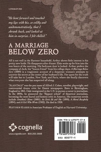 All is not well in the Ravener household. Arthur shows little interest in his pretty new bride. He disappears after dinner. Elsie waits up for him into the wee hours of the morning. His bedroom door is locked. Arthur prefers the company of Jack, his “bosom friend” from his college days. A Marriage Below Zero (1889) is a tragicomic account of a desperate woman’s attempts to uncover the secret at the center of her husband’s life. Her quest for the truth will take her to London, New York, and Paris, where she finally discovers what everyone else has suspected all along. “ALAN DALE” was the pen name of Alfred J. Cohen, novelist, playwright, and the controversial drama critic for Hearst newspapers. Born in Birmingham, England in 1861, Dale immigrated to the U.S. to pursue a career in journalism. In the 1890s, he pioneered the “flippant school” of theatrical journalism, becoming the most feared and famous critic in America. His numerous novels include Jonathan’s Home (1885), An Eerie He and She (1890), A Moral Busybody (1894), and A Girl Who Wrote (1902). He died in 1928.