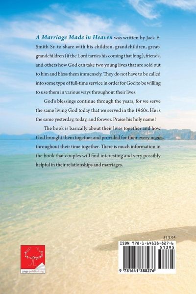 A Marriage Made in Heaven was written by Jack E. Smith Sr. to share with his children, grandchildren, great-grandchildren (if the Lord tarries his coming that long), friends, and others how God can take two young lives that are sold out to him and bless them immensely. They do not have to be called into some type of full-time service in order for God to be willing to use them in various ways throughout their lives. God's blessings continue through the years, for we serve the same living God today that we served in the 1960s. He is the same yesterday, today, and forever. Praise his holy name! The book is basically about their lives together and how God brought them together and provided for their every need throughout their time together. There is much information in the book that couples will find interesting and very possibly helpful in their relationships and marriages.