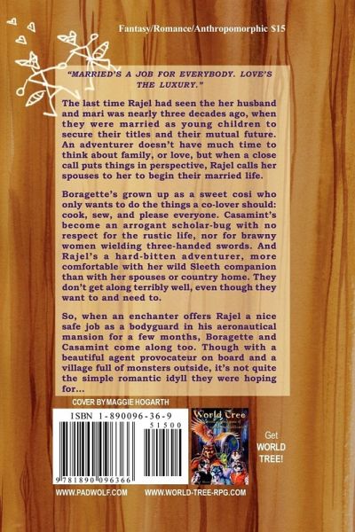 "MARRIED'S A JOB FOR EVERYBODY. LOVE'S THE LUXURY." The last time Rajel had seen the her husband and mari was nearly three decades ago, when they were married as young children to secure their titles and their mutual future. An adventurer doesn't have much time to think about family, or love, but when a close call puts things in perspective, Rajel calls her spouses to her to begin their married life. Boragette's grown up as a sweet cosi who only wants to do the things a co-lover should: cook, sew, and please everyone. Casamint's become an arrogant scholar-bug with no respect for the rustic life, nor for brawny women wielding three-handed swords. And Rajel's a hard-bitten adventurer, more comfortable with her wild Sleeth companion than with her spouses or country home. They don't get along terribly well, even though they want to and need to. So, when an enchanter offers Rajel a nice safe job as a bodyguard in his aeronautical mansion for a few months, Boragette and Casamint come along too. Though with a beautiful agent provocateur on board and a village full of monsters outside, it's not quite the simple romantic idyll they were hoping for.