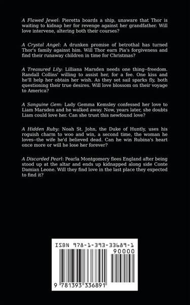 A Flawed Jewel: Pieretta boards a ship, unaware that Thor is waiting to kidnap her for revenge against her grandfather. Will love intervene, altering both their courses? A Crystal Angel: A drunken promise of betrothal has turned Thor's family against him. Will Thor earn Pia's forgiveness and find their runaway children in time for Christmas? A Treasured Lily: Lilliana Marsden needs one thing--freedom. Randall Collins' willing to assist her, for a fee. One kiss and he'll help her obtain her wish. As they set sail sparks fly, both questioning their true desires. Will love blossom on their voyage to America? A Sanguine Gem: Lady Gemma Kemsley confessed her love to Liam Marsden and he walked away. Now, years later, she doubts Liam could love her. Can she trust this newfound love? A Hidden Ruby: Noah St. John, the Duke of Huntly, uses his roguish charm to woo and win, a second time, the woman he loves--the wife he'd believed dead. Can he win Rubina's heart once more or will he lose her forever? A Discarded Pearl: Pearla Montgomery flees England after being stood up at the altar and ends up kidnapped along side Conte Damian Leone. Will they find love in the last place they expected to find it?