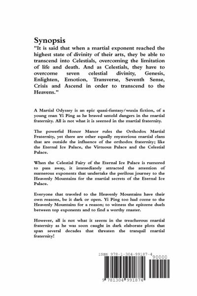 Synopsis ""It is said that when a martial exponent reached the highest state of divinity of their arts, they be able to transcend into Celestials, overcoming the limitation of life and death. And as Celestials, they have to overcome seven celestial divinity, Genesis, Enlighten, Emotion, Transverse, Seventh Sense, Crisis and Ascend in order to transcend to the Heavens."" A Martial Odyssey is an epic quasi-fantasy/wuxia fiction spanning three books. The powerful Honor Manor rules the Orthodox Martial Fraternity, yet there are other equally mysterious martial clans that are outside the influence of the orthodox fraternity; like the Eternal Ice Palace, the Virtuous Palace and the Celestial Palace. When the Celestial Fairy of the Eternal Ice Palace is rumored to pass away, it immediately attracted the attention of numerous exponents that undertake the perilous journey to the Heavenly Mountains for the martial secrets of the Eternal Ice Palace.