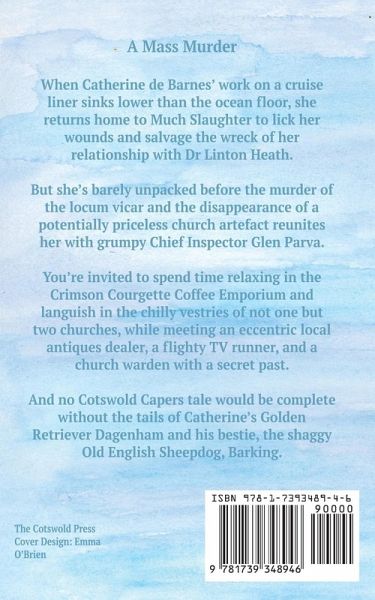 When Catherine de Barnes' work on a cruise liner sinks lower than the ocean bed, she returns home to Much Slaughter to lick her wounds and try to salvage the wreck of her relationship with Dr Linton Heath. But she's barely unpacked before the murder of the locum vicar and the disappearance of a potentially priceless church artefact reunites her with grumpy Chief Inspector Glen Parva. You're invited to spend time relaxing in the Crimson Courgette Coffee Emporium and languish in the chilly vestries of not one but two churches, while meeting an eccentric local antiques dealer, a flighty TV runner, and a church warden with a secret past. And no Cotswold Capers tale would be complete without the tails of Catherine's Golden Retriever Dagenham and his bestie, the shaggy Old English Sheepdog, Barking