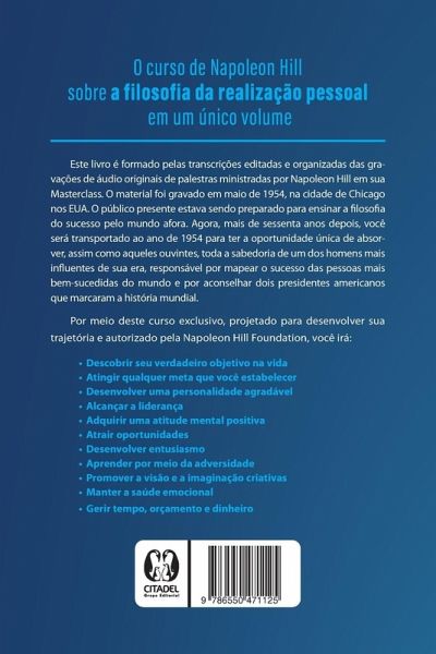O curso de Napoleon Hill sobre a filosofia da realização pessoal em um único volume. Este livro é formado pelas transcrições editadas e organizadas das gravações de áudio originais de palestras ministradas por Napoleon Hill em sua Masterclass. O material foi gravado em maio de 1954, na cidade de Chicago nos EUA. O público presente estava sendo preparado para ensinar a filosofia do sucesso pelo mundo afora. Agora, mais de sessenta anos depois, você será transportado ao ano de 1954 para ter a oportunidade única de absorver, assim como aqueles ouvintes, toda a sabedoria de um dos homens mais influentes de sua era, responsável por mapear o sucesso das pessoas mais bem-sucedidas do mundo e por aconselhar dois presidentes americanos que marcaram a história mundial. Por meio deste curso exclusivo, projetado para desenvolver sua trajetória e autorizado pela Napoleon Hill Foundation, você irá: ¿ Descobrir seu verdadeiro objetivo de vida ¿ Atingir qualquer meta que você estabelecer ¿ Desenvolver uma personalidade agradável ¿ Alcançar a liderança ¿ Adquirir uma atitude mental positiva ¿ Atrair oportunidades ¿ Desenvolver entusiasmo ¿ Aprender por meio da adversidade ¿ Promover a visão e a imaginação criativas ¿ Manter a saúde emocional ¿ Gerir tempo, orçamento e dinheiro