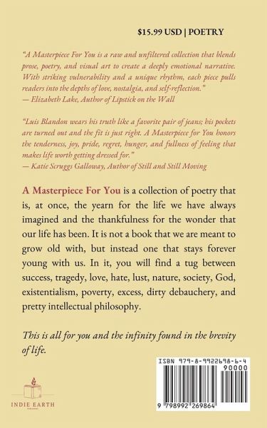 A Masterpiece For You is a collection of poetry that is, at once, the yearn for the life we have always imagined and the thankfulness for the wonder that our life has been. It is not a book that we are meant to grow old with, but instead one that stays forever young with us. In it, you will find a tug between success, tragedy, love, hate, lust, nature, society, God, existentialism, poverty, excess, dirty debauchery, and pretty intellectual philosophy. This is all for you and the infinity found in the brevity of life.