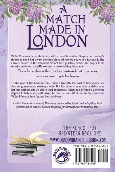 Welcome to book one in the new series The School for Spinsters by award winning author Michelle Willingham. Violet Edwards is painfully shy with a terrible stutter. Despite her mother's threats to send her away, she has plans of her own to win a husband. She enrolls herself in the infamous School for Spinsters, where she hopes to be transformed from a wallflower into a breathtaking debutante. The only problem is that the headmistress hired a gorgeous, notorious rake to give her lessons. To the rest of the London ton, Damian Everett, the Earl of Scarsdale, is a charming gentleman seeking a wife. But his father's mountain of debts have left him with no choice but to wed an heiress. When he's offered a generous stipend to help a shy wallflower, he can't refuse. All he has to do is provoke Violet Edwards into finding her backbone. As their lessons turn sensual, Damian is captivated by Violet...and he's falling hard. But how can he turn his back on his family for the wallflower he wants to love? The School for Spinsters Book 1 - A Match Made in London Book 2 - Match Me, I'm Falling Book 3 - Match Me If You Can