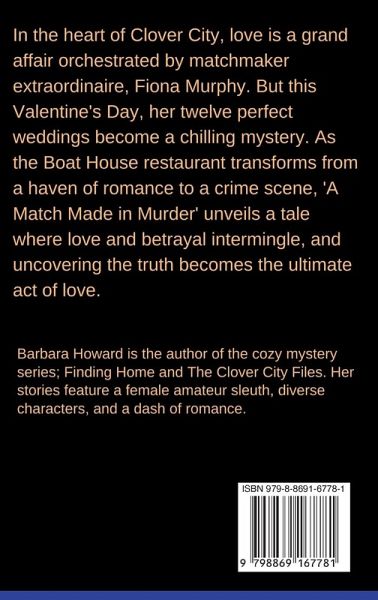 In the heart of the charming town of Clover City, matchmaker extraordinaire, Fiona Murphy, is renowned for orchestrating love stories that culminate in dreamy weddings. This Valentine's Day, she's outdone herself by arranging twelve weddings in a grand celebration at the upscale Boat House restaurant, where love is on the menu and bliss is in the air. As the town gathers for the grand event, excitement and anticipation fill the room, Among the attendees is Fiona's efficient and loyal assistant, eager to ensure everything runs smoothly. There's also an unexpected guest-Fiona's charismatic yet enigmatic ex-husband, whose presence adds a layer of complexity to the festivities. However, as the festivities kick off, a hushed realization sweeps through the gathering-someone is conspicuously absent. The joyous occasion takes a dark turn when a lifeless body is discovered, casting a shadow over the day meant for love and celebration. Suddenly, the Boat House transforms from a haven of romance to a crime scene, and everyone present becomes a suspect. With the victim silenced forever, secrets, grudges, and long-buried emotions rise to the surface. The task of unraveling the twisted threads of this romantic tragedy falls into the hands of the local patrons, as the Boat House becomes a stage for a mystery where the appetizer is suspicion, the main course is intrigue, and the dessert is justice. "A Match Made in Murder" is a cozy mystery that combines the warmth of romance with the suspense of a whodunit, set against the backdrop of a Valentine's Day celebration gone awry. Prepare to be captivated by a tale where love and betrayal intermingle, and where uncovering the truth becomes the ultimate act of love.