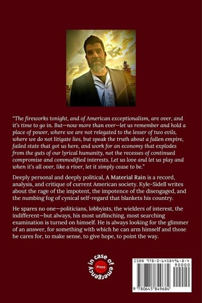 Deeply personal and deeply political, the poems of Kyle-Sidell in A Material Rain are a record, analysis, and critique of current American society. His poetry describes the rage of the impotent, the impotence of the disengaged, and the numbing fog of cynical self-regard that blankets his country. He spares no one - politicians, lobbyists, the wielders of interest, the indifferent - but always, his most unflinching, most searching examination is turned on himself. He is always looking for the glimmer of an answer, for something with which he can arm himself and those he cares for, to make sense, to give hope, to point the way.