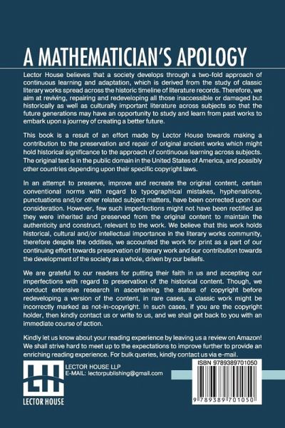 A Mathematician's Apology This book is a result of an effort made by us towards making a contribution to the preservation and repair of original classic literature. In an attempt to preserve, improve and recreate the original content, we have worked towards: 1. Type-setting & Reformatting: The complete work has been re-designed via professional layout, formatting and type-setting tools to re-create the same edition with rich typography, graphics, high quality images, and table elements, giving our readers the feel of holding a 'fresh and newly' reprinted and/or revised edition, as opposed to other scanned & printed (Optical Character Recognition - OCR) reproductions. 2. Correction of imperfections: As the work was re-created from the scratch, therefore, it was vetted to rectify certain conventional norms with regard to typographical mistakes, hyphenations, punctuations, blurred images, missing content/pages, and/or other related subject matters, upon our consideration. Every attempt was made to rectify the imperfections related to omitted constructs in the original edition via other references. However, a few of such imperfections which could not be rectified due to intentional\unintentional omission of content in the original edition, were inherited and preserved from the original work to maintain the authenticity and construct, relevant to the work. We believe that this work holds historical, cultural and/or intellectual importance in the literary works community, therefore despite the oddities, we accounted the work for print as a part of our continuing effort towards preservation of literary work and our contribution towards the development of the society as a whole, driven by our beliefs. We are grateful to our readers for putting their faith in us and accepting our imperfections with regard to preservation of the historical content. HAPPY READING!