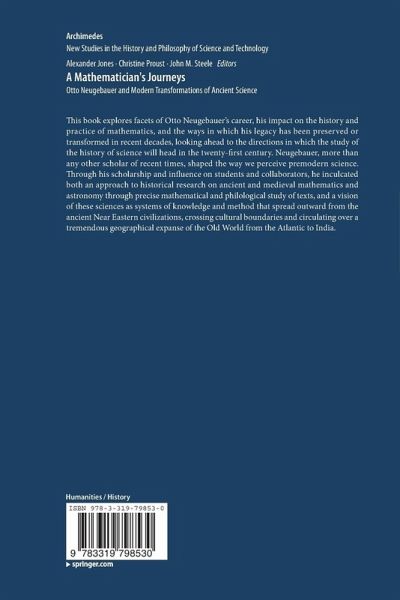 "The editors Alexander Jones, Christine Proust, and John Steele are to be congratulated ... on a volume filled with new and incisive observations on the twentieth century's central figure in the history of ancient mathematical and mathematical astronomical science. Each paper serves to illustrate a facet of the transformative effect on the study of ancient science of Neugebauer's research. A Mathematician's Journeys is a must read for anyone interested in the historiography of ancient science since the late nineteenth century." (Francesca Rochberg, Journal for the History of Astronomy, Vol. 48 (3), 2017)