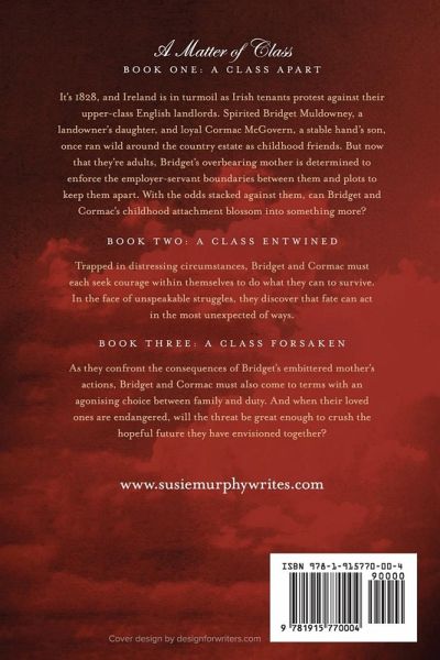 'I am completely blown away by this series...Simply outstanding.' Book Reviews for U, book reviewer This single paperback volume contains the first, second and third books in Susie Murphy's historical fiction series A Matter of Class. Society said they shouldn't fall in love... A Class Apart: It's 1828, and Ireland is in turmoil as Irish tenants protest against their upper-class English landlords. Spirited Bridget Muldowney, a landowner's daughter, and loyal Cormac McGovern, a stable hand's son, once ran wild around the country estate as childhood friends. But now that they're adults, Bridget's overbearing mother is determined to enforce the employer-servant boundaries between them and plots to keep them apart. With the odds stacked against them, can Bridget and Cormac's childhood attachment blossom into something more? They never thought they'd see each other again... A Class Entwined: Trapped in distressing circumstances, Bridget and Cormac must each seek courage within themselves to do what they can to survive. In the face of unspeakable struggles, they discover that fate can act in the most unexpected of ways. His past could destroy their future... A Class Forsaken: As they confront the consequences of Bridget's embittered mother's actions, Bridget and Cormac must also come to terms with an agonising choice between family and duty. And when their loved ones are endangered, will the threat be great enough to crush the hopeful future they have envisioned together? The story continues in the fourth book in the series, A Class Coveted. Praise for A Matter of Class: 'A beautifully written historical novel with characters who linger long after the last page is turned.' Hazel Gaynor, New York Times bestselling author of The Girl Who Came Home 'Not only are Murphy's characters well developed, interesting, and genuine, but their love story is epic...These books have been wonderful reads and capture the essence of sweeping saga.' The Lit Bitch, book reviewer 'This series keeps getting better...Once I started reading this book, it was so hard to stop...Such evocative writing.' Elizabeth Bell, author of the Lazare Family Saga 'Murphy must own a time machine, or else she couldn't possibly do such a good job of sucking a modern-day reader completely back into 1800s Ireland. The story of Bridget and Cormac comes vividly to life in this sweeping tale of romance.' Ashley O'Melia, author and freelance writer 'An Irish historical saga full of romance and betrayal across the class divide...My heart broke repeatedly for the characters...Highly recommend!' Kelsey Gietl, author of Across Oceans 'With adventure and drama and romance, this is a series I'll continue to recommend left, right and centre.' Between My Lines, book reviewer 'Susie Murphy is an exceptional writer, with a keen ability for creating memorable characters and sweeping settings...Settle in for your new favorite book series.' Pursuing Stacie, book reviewer What readers are saying: ¿¿¿¿¿ 'The Irish Downton Abbey! Fabulous.' ¿¿¿¿¿ 'If it was possible to give 100 stars to this book, I would!' ¿¿¿¿¿ 'An absolute page turner.' ¿¿¿¿¿ 'This is a fantastic saga! I am completely hooked!' ¿¿¿¿¿ 'A brilliant love story.' ¿¿¿¿¿ 'A hugely satisfying read.' ¿¿¿¿¿ 'If you love romance and historical regency then this series is for you.' ¿¿¿¿¿ 'Don't contemplate whether or not to read it, just read it!' ¿¿¿¿¿ 'Superbly written.' ¿¿¿¿¿ 'I just couldn't put it down.'