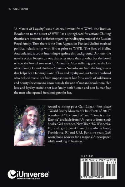 "A Matter of Loyalty" uses historical events from WWI, the Russian Revolution to the outset of WWII as a springboard for action: Chilling theories are presented as fiction regarding the disappearance of the Russian Royal family. Then there is the Non Aggression Pact and Stalin's strained political relationship with Hitler prior to WWII. The lives of Stalin, Anastasia and a count intermingle against this background. At times the novel's action focuses on one character more than another for the novel reflects the love of two men for Anastasia. After suffering grief at the loss of her family, Grand Duchess Anastasia Nicholaevna finds the forgiveness that helps her. Her story is one of love and loyalty not just for her husband who helped rescue her from imprisonment but for a world of wilderness and beauty she comes to know outside the one of war and revolution. Her love and loyalty encircle not just family both human and non human but the man who opened freedom's gate for her.