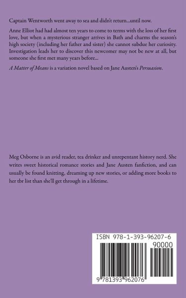 Captain Wentworth went away to sea and didn't return...until now. Anne Elliot had had almost ten years to come to terms with the loss of her first love, but when a mysterious stranger arrives in Bath and charms the season's high society (including her father and sister) she cannot subdue her curiosity. Investigation leads her to discover this newcomer may not be new at all, but someone she first met many years before... A Matter of Means is a variation novel based on Jane Austen's Persuasion.