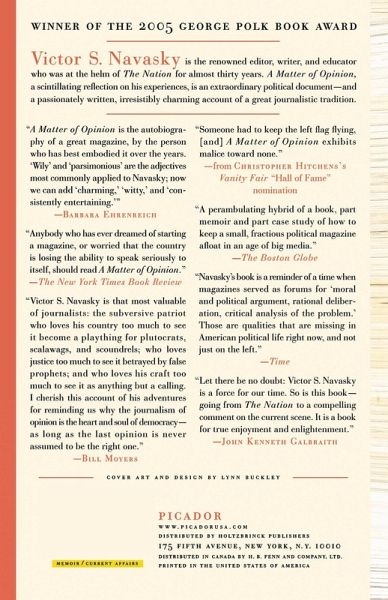 Winner of the 2005 George Polk Book Award Victor S. Navasky is the renowned editor, writer, and educator who was at the helm of The Nation for almost thirty years. A Matter of Opinion, a scintillating reflection on his experiences, is an extraordinary political document--and a passionately written, irresistibly charming account of a great journalistic tradition.
