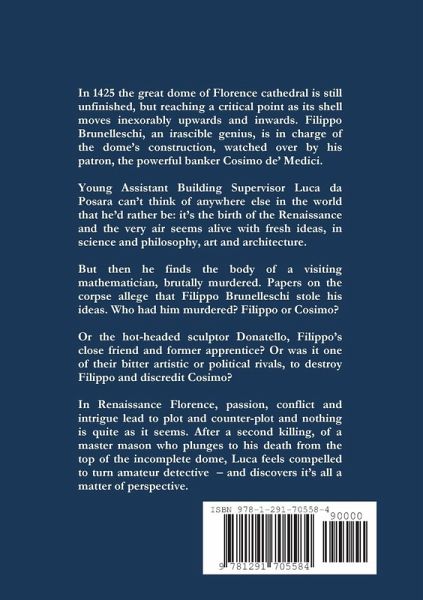 In 1425 the building of the great dome of Florence cathedral is reaching a critical point. Filippo Brunelleschi, an irascible genius, is in charge of its construction, watched over by his patron, the powerful banker Cosimo de' Medici. Young Assistant Building Supervisor Luca da Posara can't think of anywhere else in the world that he'd rather be: it's the birth of the Renaissance and the very air seems alive with fresh ideas, in science, philosophy, art and architecture. But then he finds the body of a visiting mathematician, brutally murdered. Papers on the corpse allege that Filippo Brunelleschi stole his ideas. Who had him murdered? Filippo or Cosimo? Or the hot-headed sculptor Donatello, Filippo's closest friend? Or one of their bitter artistic or political rivals, to destroy Filippo and discredit Cosimo? After a second killing, Luca feels compelled to turn amateur detective - and discovers it's all a matter of perspective.