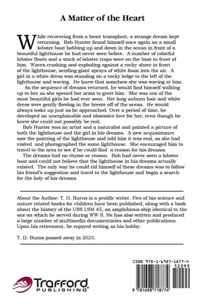 While recovering from a heart transplant, a strange dream kept returning. Bob Hunter found himself once again on a small lobster boat bobbing up and down in the ocean in front of a beautiful lighthouse he had never seen before. A number of colorful lobster floats and a stack of lobster traps were on the boat in front of him. Waves crashing and exploding against a rocky shore in front of the lighthouse, sending giant sprays of white foam into the air. A girl in a white dress was standing on a rocky ledge to the left of the lighthouse and waving. He knew that somehow she was waving at him. As the sequence of dreams returned, he would find himself walking up to her as she opened her arms to greet him. She was one of the most beautiful girls he had ever seen. Her long auburn hair and white dress were gently flowing in the breeze off of the ocean. He would always wake up just as he approached. Over a period of time, he developed an unexplainable and obsessive love for her, even though he knew she could not possibly be real. Bob Hunter was an artist and a naturalist and painted a picture of both the lighthouse and the girl in his dreams. A new acquaintance saw the painting of the lighthouse and told him it was real, as she had visited and photographed the same lighthouse. She encouraged him to travel to the area to see if he could find a reason for his dreams. The dreams had no rhyme or reason. Bob had never seen a lobster boat and could not believe that the lighthouse in his dreams actually existed. The only way he could rid himself of these dreams was to follow his friend's suggestion and travel to the lighthouse and begin a search for the lady of his dreams.