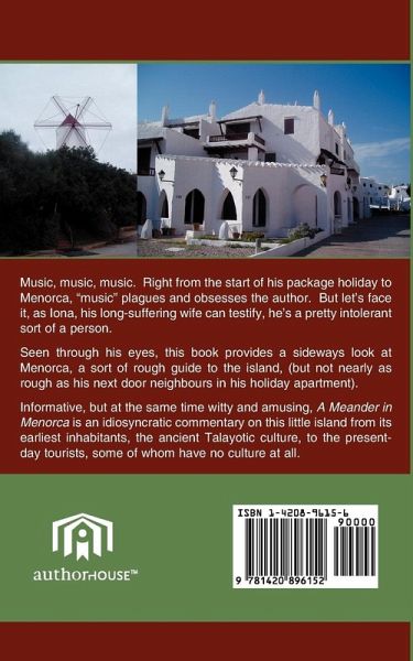 Music, music, music. Right from the start of his package holiday to Menorca, "music" plagues and obsesses the author. But let's face it, as Iona, his long-suffering wife can testify, he's a pretty intolerant sort of a person. Seen through his eyes, this book provides a sideways look at Menorca, a sort of rough guide to the island, (but not nearly as rough as his next door neighbours in his holiday apartment). Informative, but at the same time witty and amusing, A Meander in Menorca is an idiosyncratic commentary on this little island from its earliest inhabitants, the ancient Talayotic culture, to the present-day tourists, some of whom have no culture at all.