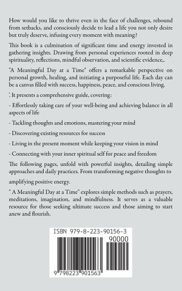 How would you like to thrive even in the face of challenges, rebound from setbacks, and consciously decide to lead a life you not only desire but truly deserve, infusing every moment with meaning? This book is a culmination of significant time and energy invested in gathering insights. Drawing from personal experiences rooted in deep spirituality, reflections, mindful observation, and scientific evidence,. "A Meaningful Day at a Time" offers a remarkable perspective on personal growth, healing, and initiating a purposeful life. Each day can be a canvas filled with success, happiness, peace, and conscious living. - Effortlessly taking care of your well-being and achieving balance in all aspects of life - Tackling thoughts and emotions, mastering your mind - Discovering existing resources for success - Living in the present moment while keeping your vision in mind - Connecting with your inner spiritual self for peace and freedom The following pages, unfold with powerful insights, detailing simple approaches and daily practices. From transforming negative thoughts to amplifying positive energy, " A Meaningful Day at a Time'' explores simple methods such as prayers, meditations, imagination, and mindfulness. It serves as a valuable resource for those seeking ultimate success and those aiming to start anew and flourish.