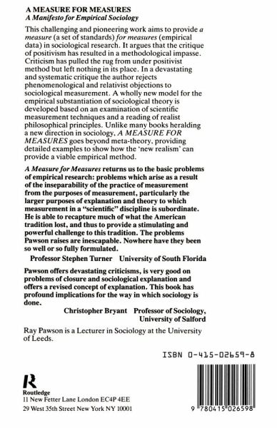 This challenging and pioneering work aims to provide a measure (a set of standards) for measures (empirical data) in sociological research. This book goes beyond meta-theory, providing detailed examples to show how the 'new realism' can provide a viable empirical method.