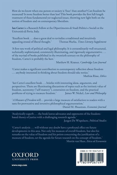 It is often said that one person or society is 'freer' than another, or that people have a right to equal freedom, or that freedom should be increased or even maximized. Such quantitative claims about freedom are of great importance to us, forming an essential part of our political discourse and theorizing. Yet their meaning has been surprisingly neglected by political philosophers until now. Ian Carter provides the first systematic account of the nature and importance of our judgements about degrees of freedom. He begins with an analysis of the normative assumptions behind the claim that individuals are entitled to a measure of freedom, and then goes on to ask whether it is indeed conceptually possible to measure freedom. Adopting a coherentist approach, the author argues for a conception of freedom that not only reflects commonly held intuitions about who is freer than whom but is also compatible with a liberal or freedom-based theory of justice.