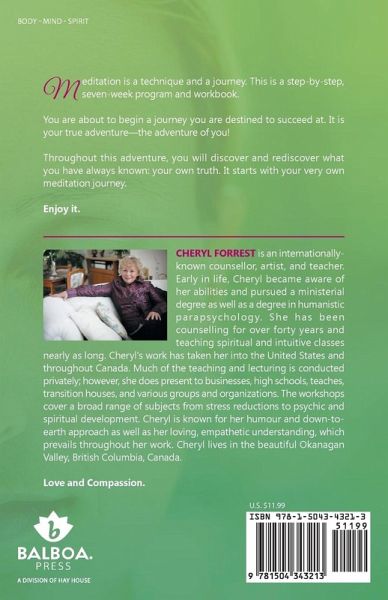 Meditation is a technique and a journey. This is a step-by-step, seven-week program and workbook. You are about to begin a journey you are destined to succeed at. It is your true adventure-the adventure of you! Throughout this adventure, you will discover and rediscover what you have always known: your own truth. It starts with your very own meditation journey. Enjoy it.