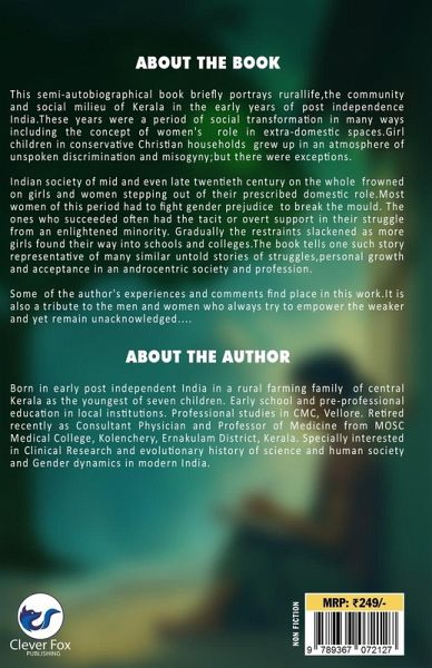 The story is a brief account of the life and aspirations of a girl child born into a conservative middle class Syrian Christian family of Kerala after India became independent. Her joys and sorrows while growing up in the essentially androcentric society are indirectly referred to. while also highlighting how a minority of generous and empathetic persons around enriched the girl's life even in the claustrophobic social milieu. The prejudice and trivialization women professionals face while trying to gain relevance in professions like medicine or STEM fields may be diminishing, but still exist. The author has dreams of witnessing a resurgent India with a confident and tolerant people with scientific temper excelling in research and innovation while retaining their spiritual awareness and legacy.