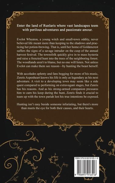 Enter the world of Runlaris where vast landscapes teem with perilous adventures and passionate amour. Evelot Wheaton, a young witch and small-town oddity, never believed life meant more than keeping to the shadows and practicing her potion-brewing. That is, until her home of Goldencrest suffers the signs of a savage intruder on the cusp of the annual harvest festival. The townsfolk quickly give in to mass hysteria and raise a frenzied hunt into the trees of the neighboring forest. The woodlands aren't to blame, but no one will listen. Not unless Evelot can make them see reason-by hunting the beast herself. With accolades aplenty and fans begging for more of his music, Zenris Aspenheart knows his life is only as legendary as his next adventure. A visit to a developing town may seem like a side quest compared to performing on extravagant stages, but Zenris has his reasons. And as his strong-armed companion pressures him to earn his keep during the hunt, Zenris finds it crucial to team up with the town pariah lest his true intentions be exposed. Hunting isn't easy beside someone infuriating, but there's more than meets the eye for both their causes, and their hearts.