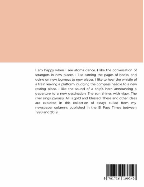 I am happy when I see atoms dance. I like the conversation of strangers in new places. I like turning the pages of books, and going on new journeys to new places. I like to hear the whistle of a train leaving a platform, nudging the compass needle to a new resting place. I like the sound of a ship's horn announcing a departure to a new destination. The sun shines with vigor. The river sings joyously. All is gold and blessed. These and other ideas are explored in this collection of essays culled from my newspaper columns published in the El Paso Times between 1998 and 2019.