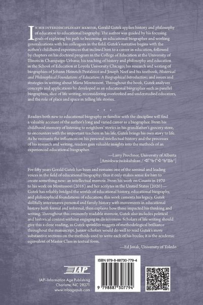 In his interdisciplinary memoir, Gerald Gutek applies history and philosophy of education to educational biography. The author was guided by his focusing goals of exploring his path to becoming an educational biographer and working generalizations with his colleagues in the field. Gutek's narrative begins with the author's childhood experiences that inclined him to a career in education, followed by chapters on his doctoral program in the College of Education at the University of Illinois in Champaign-Urbana; his teaching of history and philosophy and education in the School of Education at Loyola University Chicago; his research and writing of biographies of Johann Heinrich Pestalozzi and Joseph Neef and his textbook, Historical and Philosophical Foundations of Education: a Biographical Introduction; and issues and strategies in writing about Maria Montessori. Throughout the book, Gutek analyzes concepts and applications he developed as an educational biographer such as parallel biographies, slice of life writing, reconsidering overlooked and understudied educators, and the role of place and space in telling life stories.