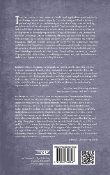 In his interdisciplinary memoir, Gerald Gutek applies history and philosophy of education to educational biography. The author was guided by his focusing goals of exploring his path to becoming an educational biographer and working generalizations with his colleagues in the field. Gutek's narrative begins with the author's childhood experiences that inclined him to a career in education, followed by chapters on his doctoral program in the College of Education at the University of Illinois in Champaign-Urbana; his teaching of history and philosophy and education in the School of Education at Loyola University Chicago; his research and writing of biographies of Johann Heinrich Pestalozzi and Joseph Neef and his textbook, Historical and Philosophical Foundations of Education: a Biographical Introduction; and issues and strategies in writing about Maria Montessori. Throughout the book, Gutek analyzes concepts and applications he developed as an educational biographer such as parallel biographies, slice of life writing, reconsidering overlooked and understudied educators, and the role of place and space in telling life stories.
