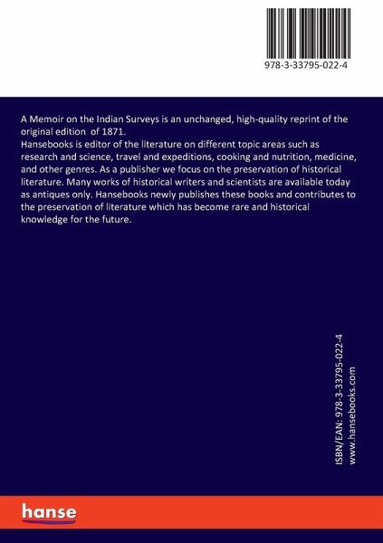 A Memoir on the Indian Surveys is an unchanged, high-quality reprint of the original edition of 1871. Hansebooks is editor of the literature on different topic areas such as research and science, travel and expeditions, cooking and nutrition, medicine, and other genres. As a publisher we focus on the preservation of historical literature. Many works of historical writers and scientists are available today as antiques only. Hansebooks newly publishes these books and contributes to the preservation of literature which has become rare and historical knowledge for the future.