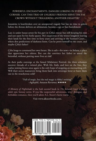 Powerful enchantments. Danger lurking in every corner. Can this trio of unlikely friends serve the fae crown without triggering another disaster? Jessamine is heartbroken over an unexpected tragedy but has no time to grieve before the throne delivers an ultimatum: become a spy or face banishment. Laec is under house-arrest for his part in Çifta's rescue but still keeping his eyes and ears open for his Seelie queen. He's suspicious of the winter kingdom leaving their lands for the first time in forty years and arriving at the Scented Court... where dire predictions of darkness loom. Can he prove himself to the court, and maybe Çifta's father? Çifta longs to command her own future. She is safe-for now-in Solana, a place that appreciates her talents. But can she convince her father to annul the betrothal, without putting more lives at risk? As their paths converge at the famed Midwinter Festival, the three schemers uncover threads of a twisted plot. With life, limb, and love on the line, they realize joining forces once again is the only hope of stopping an encroaching evil. Will their secret maneuvers bring them back into sovereign favor or leave them out in the treacherous cold? A Memory of Nightshade is the lush second book in The Scented Court a young adult epic fantasy series. If you like suspenseful adventures, witty dialogue, and forbidden romance, then you'll adore A.L. Knorr's faerie realm.