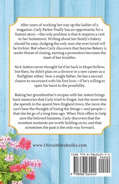 From the USA Today bestselling author of the Blue Harbor series comes a new sweet romance trilogy. The sisters of Sunrise Bakery may have all the ingredients for their grandmother's famous strawberry pie, but they're still in search of the perfect recipe for love and happiness. After years of working her way up the ladder of a magazine, Carly Parker finally has an opportunity for a feature story-the only problem is that it requires a visit to her hometown. Writing about her family's bakery should be easy; dodging the only man she ever loved will be trickier. But when Carly discovers that Sunrise Bakery is under threat of closing, earning a promotion becomes the least of her troubles. Nick Sutton never thought he'd be back in Hope Hollow, but then, he didn't plan on a divorce or a new career as a firefighter either. Now a single father, he has a second chance to reconnect with his first love-if he's willing to open his heart to the possibility. Baking her grandmother's recipes with her sisters brings back memories that Carly tried to forget, but the more time she spends in the quaint New England town, the more she can't bear the thought of losing the things-and people-that she let go of a long time ago. When Nick offers to help save the beloved business, Carly discovers that the sweetest moments are worth holding onto, and that sometimes the past is the only way forward.