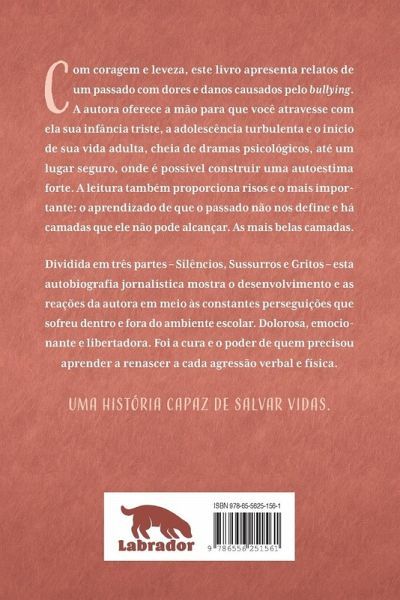 Com coragem e leveza, este livro apresenta relatos de um passado com dores e danos causados pelo bullying. A autora oferece a mão para que você atravesse com ela sua infância triste, a adolescência turbulenta e o início de sua vida adulta, cheia de dramas psicológicos, até um lugar seguro, onde é possível construir uma autoestima forte. A leitura também proporciona risos e o mais importante: o aprendizado de que o passado não nos define e há camadas que ele não pode alcançar. As mais belas camadas. Dividida em três partes - Silêncios, Sussurros e Gritos - esta autobiografia jornalística mostra o desenvolvimento e as reações da autora em meio às constantes perseguições que sofreu dentro e fora do ambiente escolar. Dolorosa, emocionante e libertadora. Foi a cura e o poder de quem precisou aprender a renascer a cada agressão verbal e física. Uma história capaz de salvar vidas.