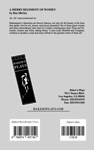 Characters: 3 male, 6 female. Representational set Shakespeare's characters are forever famous, not only for the beauty of the lines they spoke, but for wit, humor, and joyous humanity! Six of these great women and three extraordinary men meet in a totally contemporary play! Kate and Petruchio, Romeo and Juliet, daring Henry V, plus Lady Macbeth and Cleopatra, combine to produce a mad and merry tribute to the greatest writer of them all!