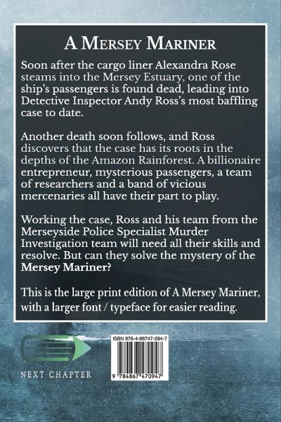 Soon after the cargo liner Alexandra Rose steams into the Mersey Estuary, one of the ship's passengers is found dead, leading into Detective Inspector Andy Ross's most baffling case to date. Another death soon follows, and Ross discovers that the case has its roots in the depths of the Amazon Rainforest. A billionaire entrepreneur, mysterious passengers, a team of researchers and a band of vicious mercenaries all have their part to play. Working the case, Ross and his team from the Merseyside Police Specialist Murder Investigation team will need all their skills and resolve. But can they solve the mystery of the Mersey Mariner? This is the large print edition of A Mersey Mariner, with a larger font / typeface for easier reading.
