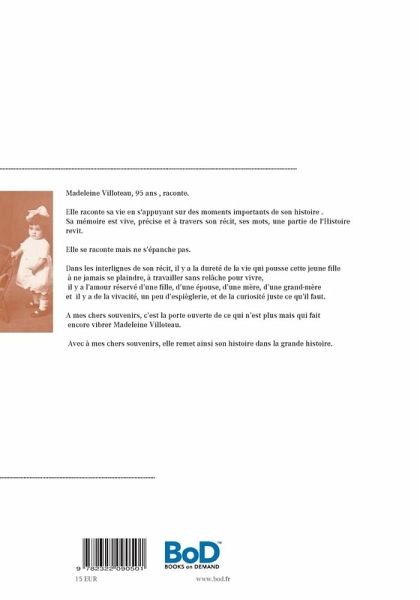 Madeleine Villoteau, 95 ans , raconte. Elle raconte sa vie en s'appuyant sur des moments importants de son histoire . Sa mémoire est vive, précise et à travers son récit, ses mots, une partie de l'Histoire revit. Elle remet ainsi son histoire dans la grande histoire.