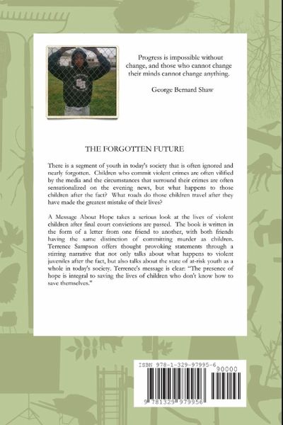 A Message About Hope takes a serious look at the lives of violent children after final court convictions are passed. The book is written in the form of a letter from one friend to another, with both friends having the same distinction of committing murder as children. Terrence Sampson offers thought provoking statements through a stirring narrative that not only talks about what happens to violent juveniles after the fact, but also talks about the state of at-risk youth as a whole in today's society. Terrence's message is clear: "The presence of hope is integral to saving the lives of children who don't know how to save themselves."