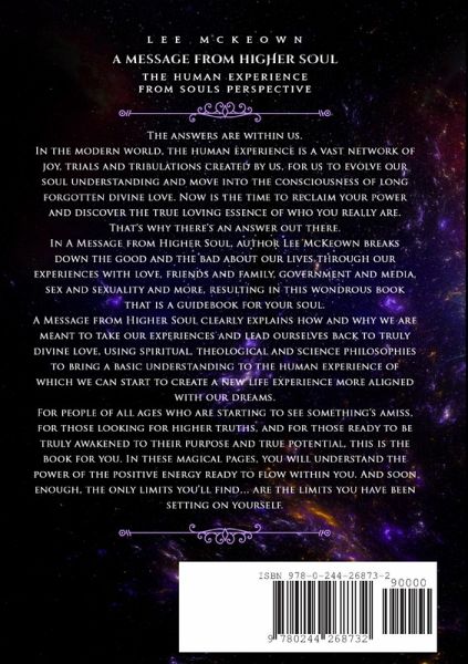 A Message from Higher Soul by Lee McKeown. This book brings a deeper understanding of the human experience from souls perspective. It talks about all manner of experiences from family and friends, to love and relationships, to sex and gender, and how these experiences are created for soul growth. My intention is to re-spark that inner knowing within one self, so that you might heal your karma, and create a new experience which is in alignment with Souls understanding and desired path, which ultimately leads to true happiness , peace and joy whilst within the human experience.